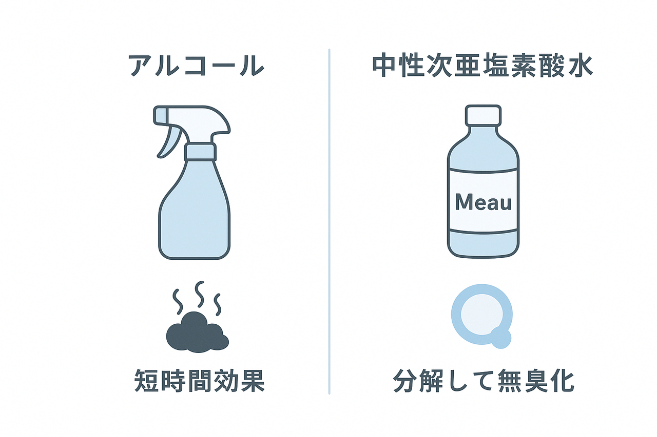 アルコールは「除菌・揮発」は得意ですが、アンモニア臭の中和・分解は苦手。